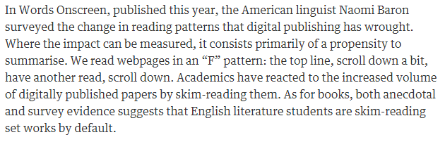 <more at http://www.theguardian.com/commentisfree/2015/aug/10/ebooks-are-changing-the-way-we-read-and-the-way-novelists-write; related links: http://www.npr.org/templates/story/story.php?storyId=122026529 (How E-Books Will Change Reading And Writing. December 30, 2009) and http://www.wsj.com/articles/SB123980920727621353 (How the E-Book Will Change the Way We Read and Write; Author Steven Johnson outlines a future with more books, more distractions -- and the end of reading alone. April 20, 2009)>